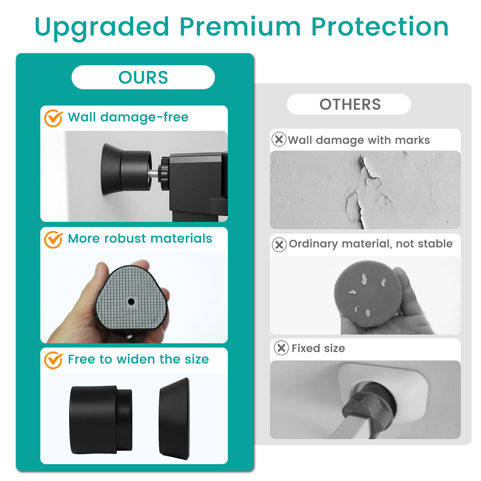 • WALL PROTECTION: Premium baby gate wall guards upgraded design with wall protection pads spread over a larger area, keep your doors, walls and other surfaces free from scratches, dents and damage. Great for covering and preventing further damage to marked surfaces, ensuring your home stays in perfect condition