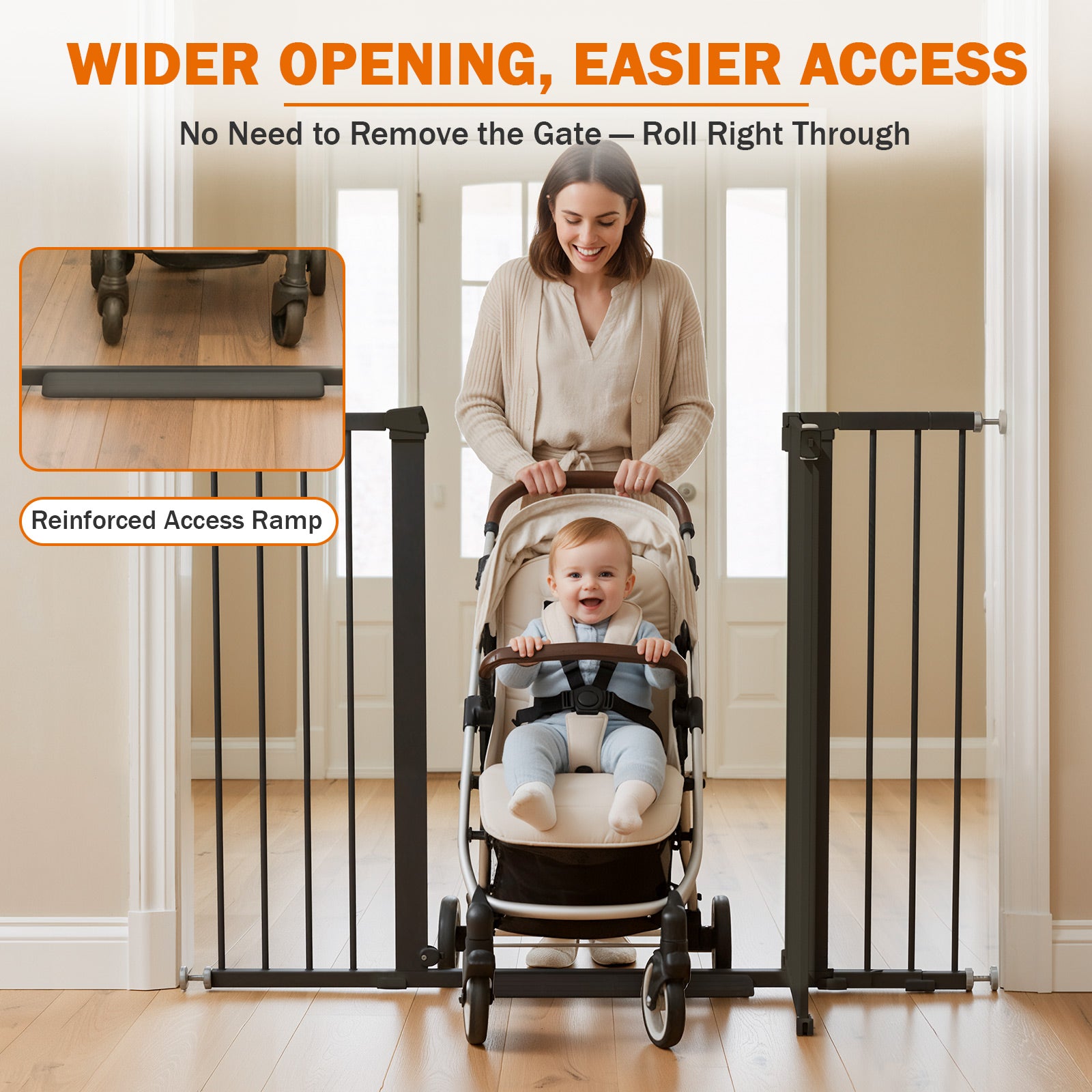 - Extra Tall & Extra Wide Fit for Stairs, Doorways & Large Openings: This extra wide baby gate stands 36" high and adjusts from 29.7"–51" wide, giving you extended coverage for wide stairs, hallways, and open floor plans. Ideal for toddlers and pets who tend to climb or push through shorter gates. The walk-through door offers quick, hassle-free access when you’re carrying your baby, laundry, or groceries.