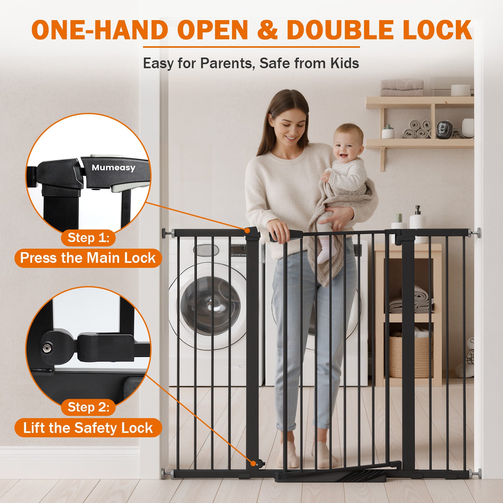 - Child-Safe Double Lock, Auto-Close & Two-Way Swing for Easy Access: The upgraded child-proof double lock keeps curious toddlers from opening the gate, while adults can operate it one-handed—ideal for busy stairways and high-traffic areas. The two-way swing safety door provides flexible entry, auto-closes when opened under 90°, and stays open at 90°, making it a convenient dog gate for stairs, hallway safety gate, and everyday household use as an indoor pet gate.