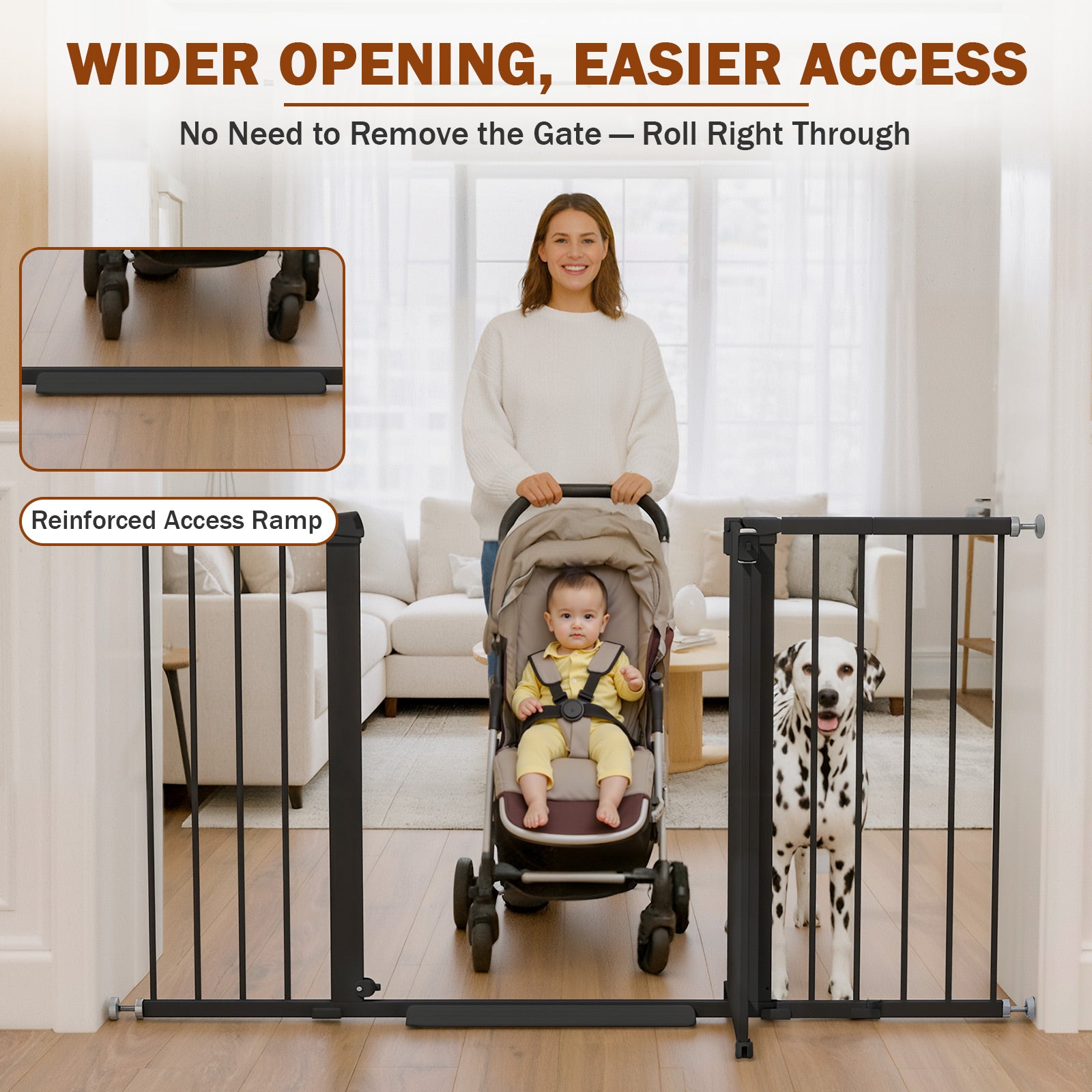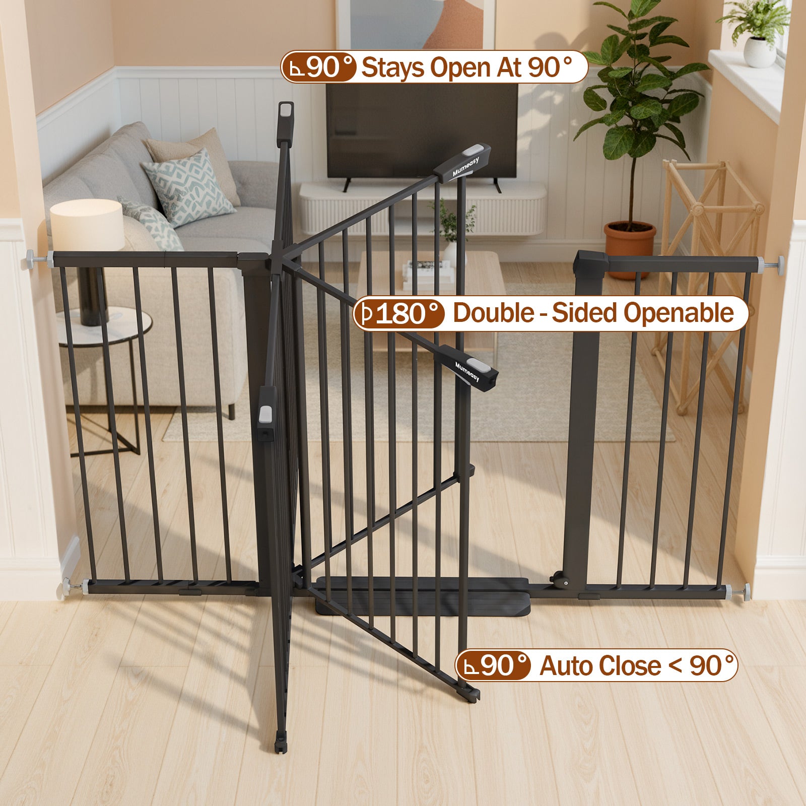 - Auto-Close Gate with Childproof Double Lock: The auto-close feature automatically shuts the gate when opened under 90°, while the double-lock mechanism prevents toddlers from opening it. Adults can operate the gate easily with one hand, and the two-way swing supports smooth daily movement.