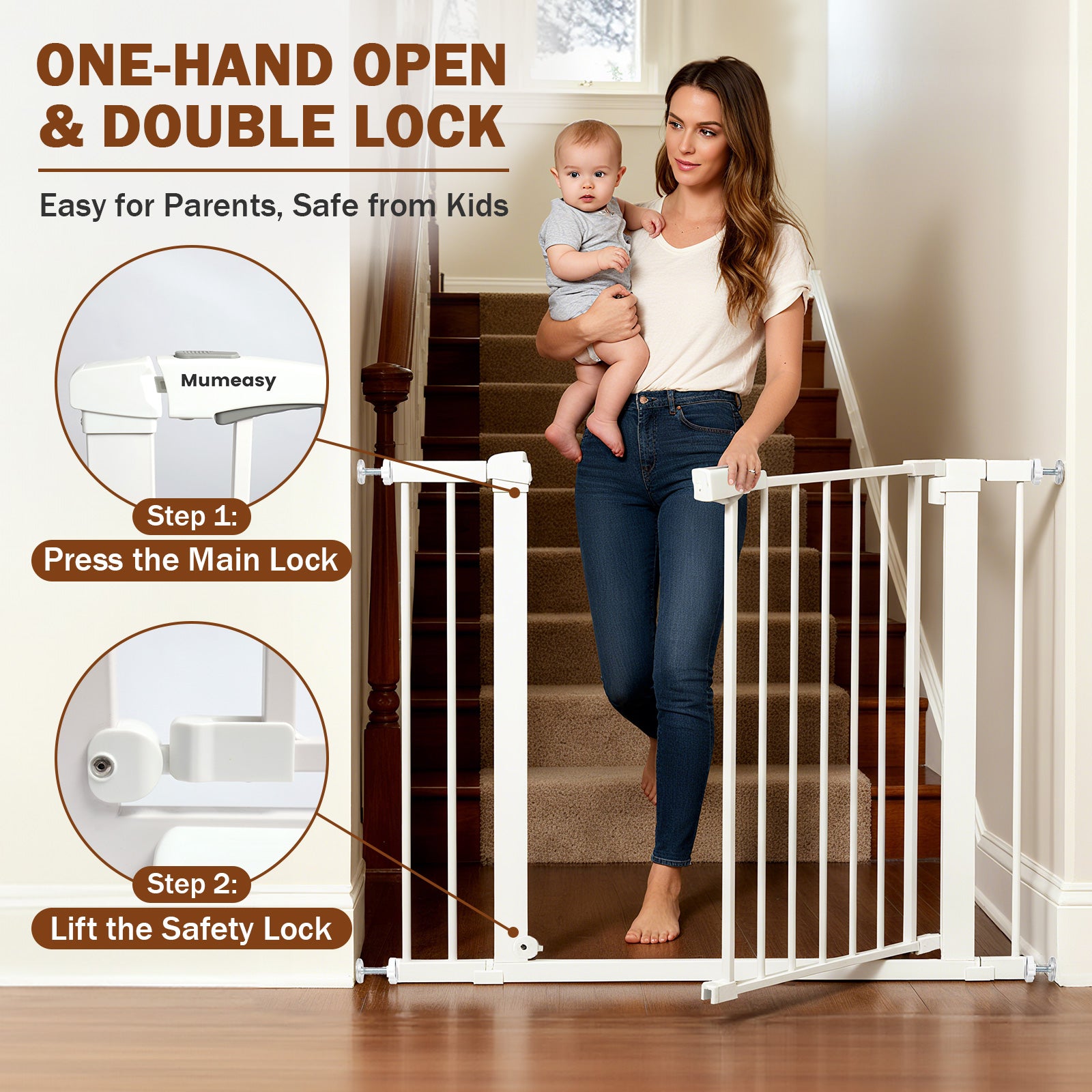 • Dual Safety Lock: The tall baby gate is with the two action handle lock, so don't worry your intelligent dog or smart baby will release it.