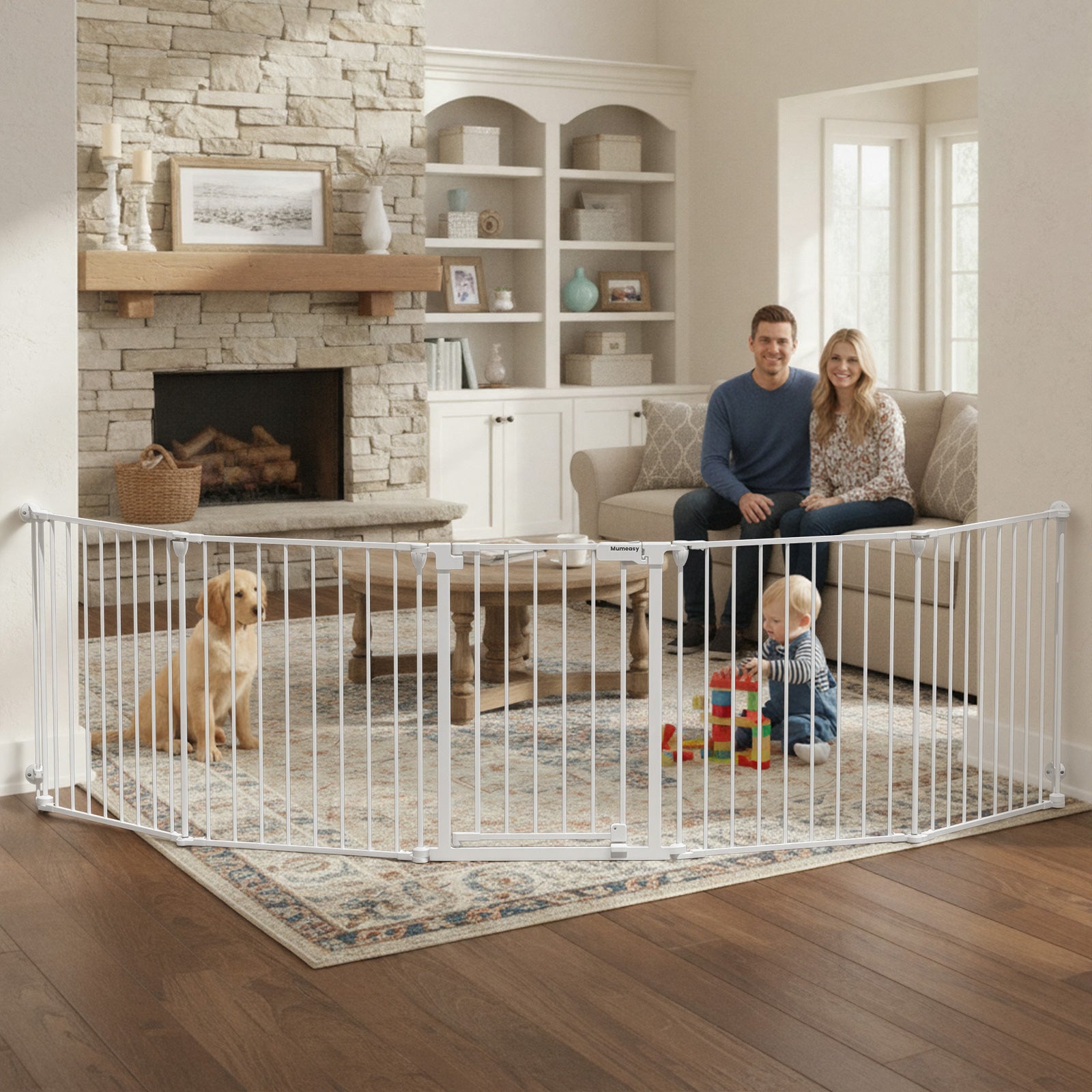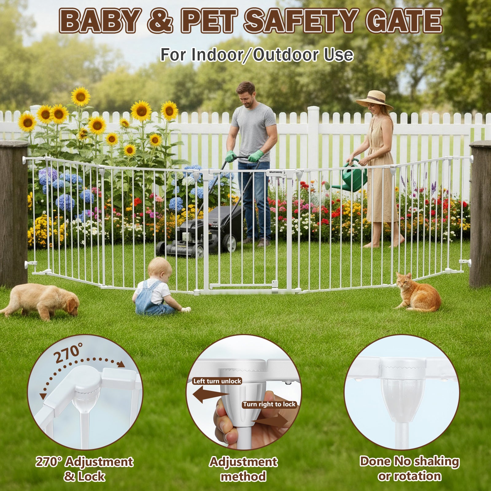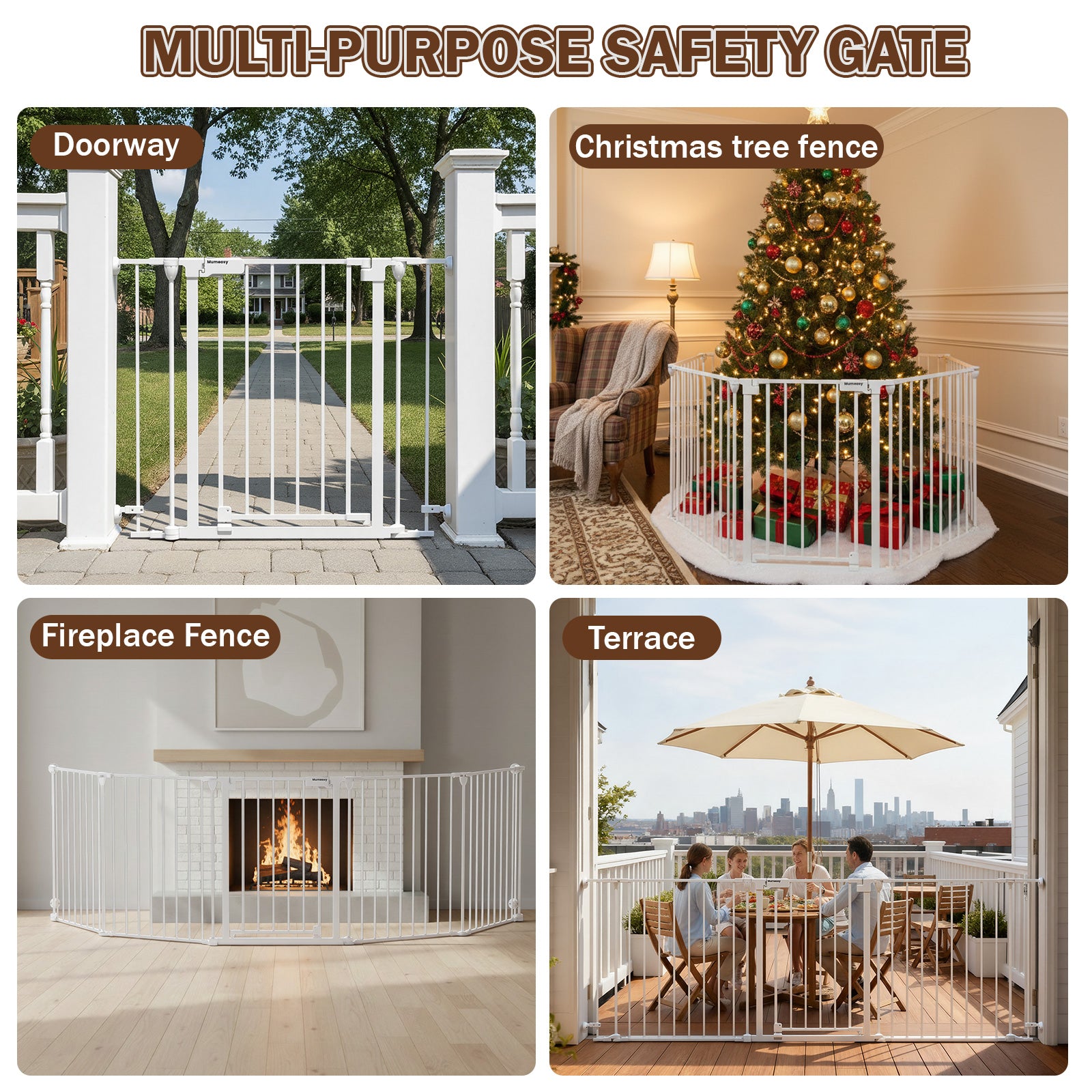- 【Adjustable Baby & Pet Safety Gate】This baby gate lets you easily add or remove panels to fit any angle or opening. The main dog gate door plus one panel works for doorways, hallways, top or bottom stairs, kitchens, living rooms, laundry rooms, and angled openings. Use two or more panels to create a safe play area around fireplaces, Christmas trees, or grills, or as an outdoor barrier for yards, gardens, garages, or other large spaces. Multiple baby fence panel sets are available: 3, 5, 6, or 8 panels, all interchangeable.