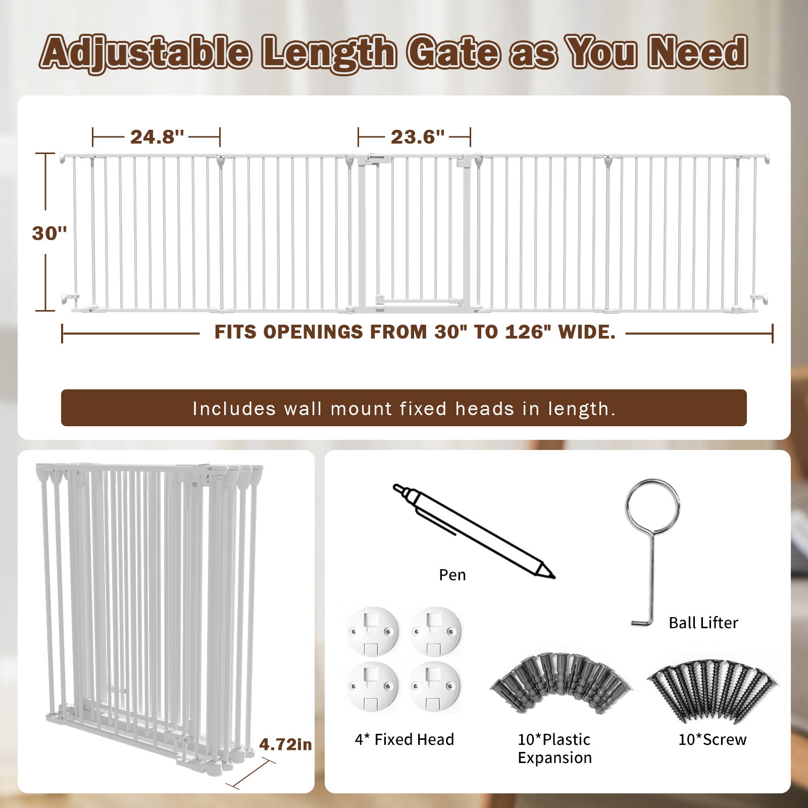 - 【Super-Wide & Foldable Large Baby Gate】Long Baby Gate fits openings from 30 to 126 inch(76–320 cm) with a height of 30 inch(76 cm) and 2.2 inch(5.6 cm) bar spacing, keeping toddlers and doggies safe. The foldable baby proof gate lays flat for easy storage and cleaning. Made from heavy-duty metal, this dog fence withstands impacts from children and pets while resisting chewing.