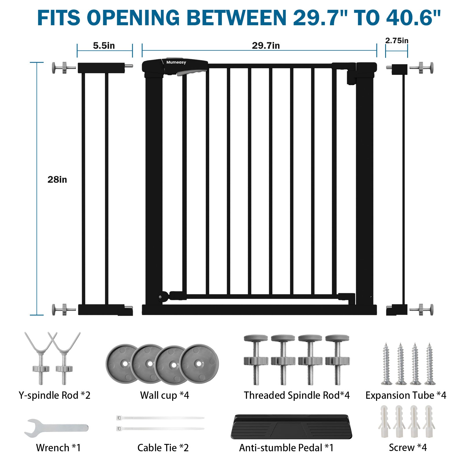 【Adjustable Baby Gate】Adjustable to fit most staircases and doorways, with widths ranging from 29.7 inches to 40.6 inches stands 28″ tall, includes one 5.5" extension and one 2.75" extension. Please note: Do not cut the cable ties before installation.