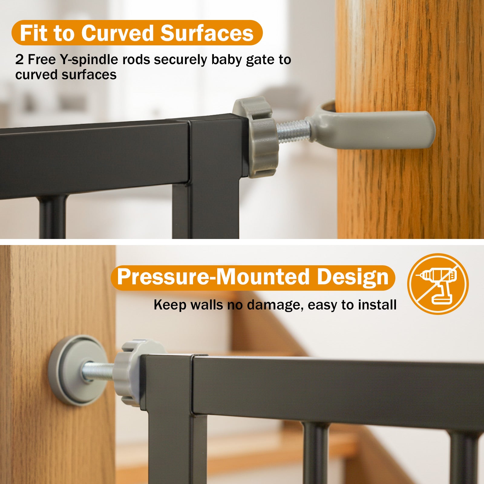 【Fit to Curved Surfaces】Equipped with 2 free Y-shaped bracket, this baby gate for stairs securely fits curved or rounded stair railings, providing extra stability and versatile protection for your home.