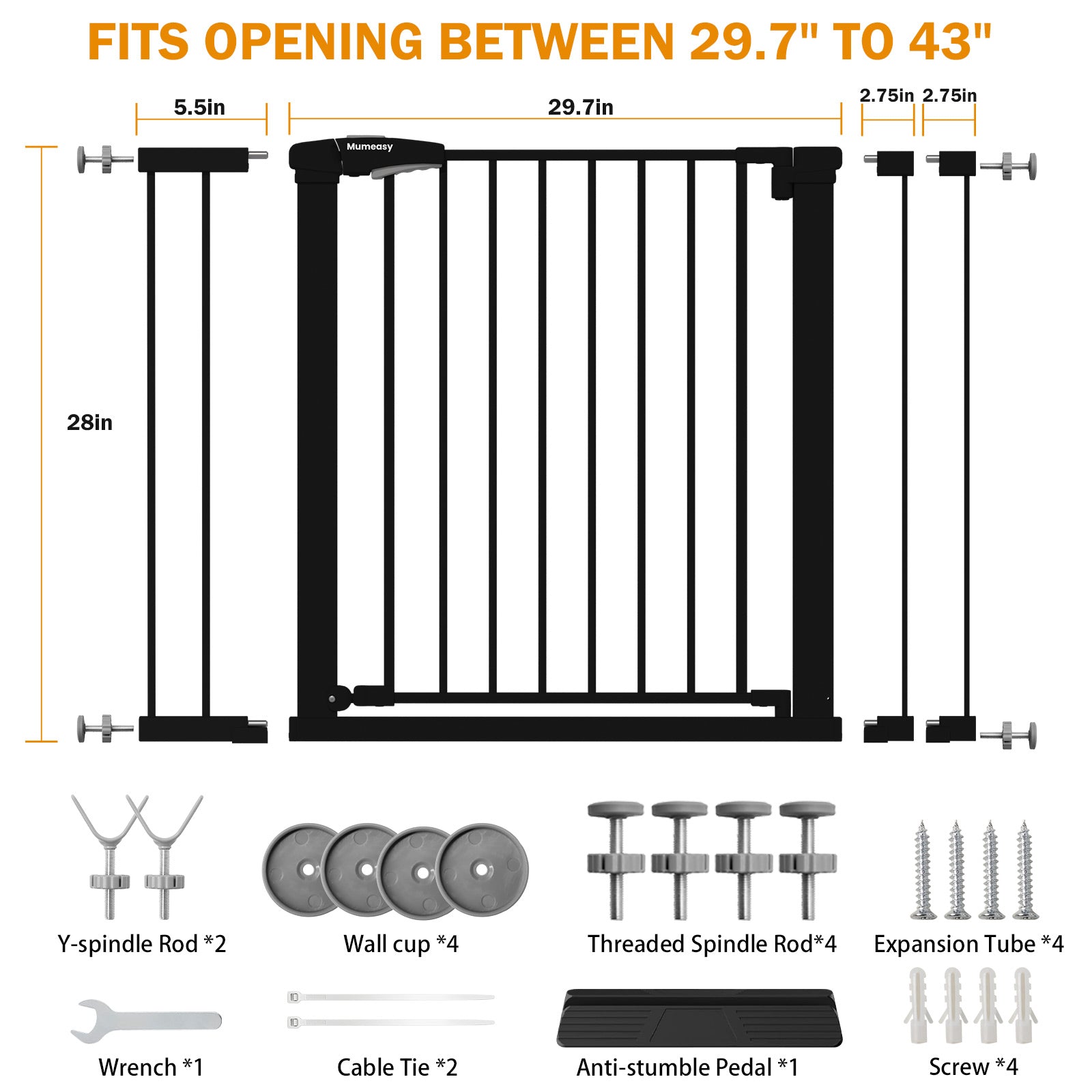 【Extra Wide】This baby gate stands 28" tall and fits openings from 29.7" to 43" wide. With two 2.75" extensions and one 5.5" extension included, you have the flexibility to install it on stairs, in doorways, or in kitchens.