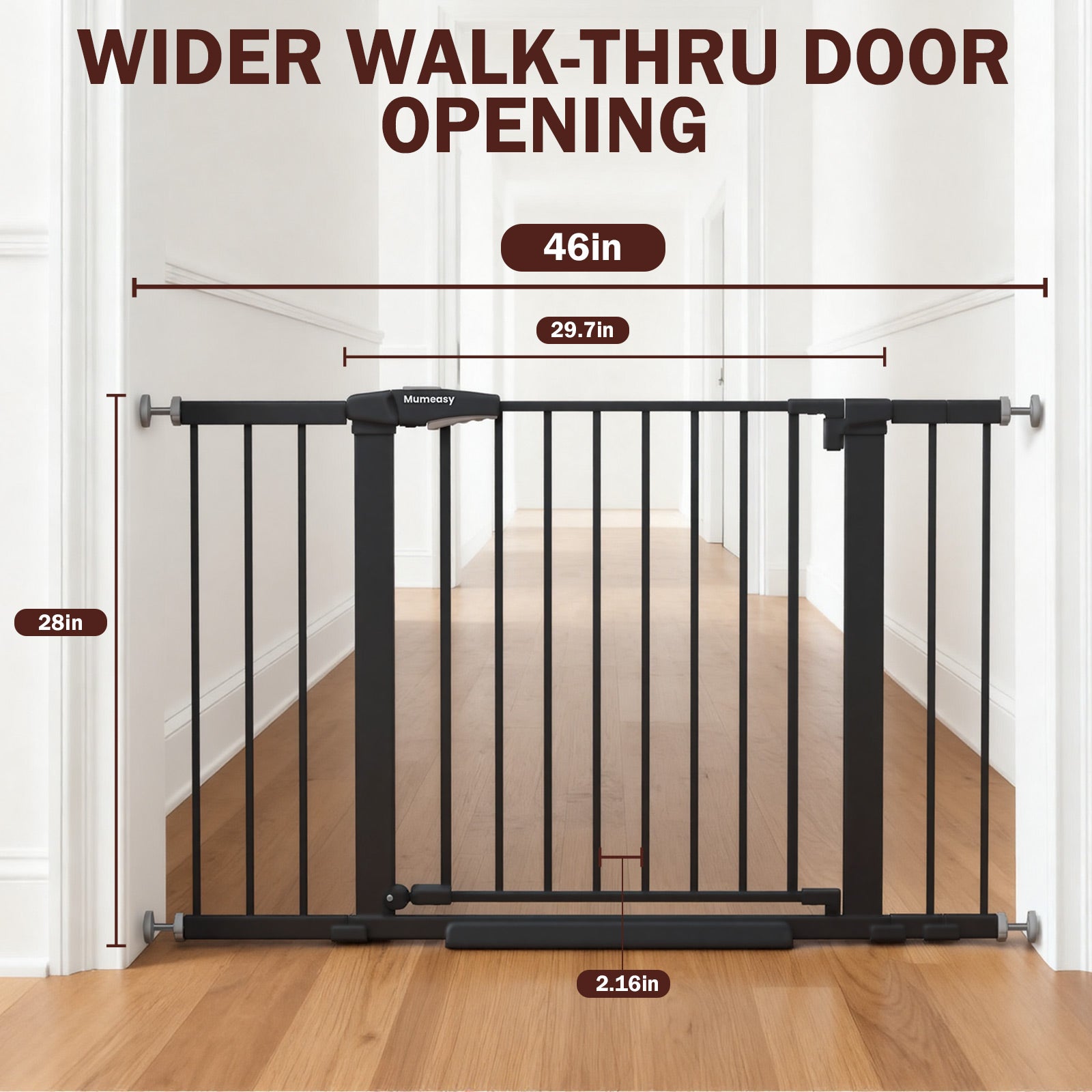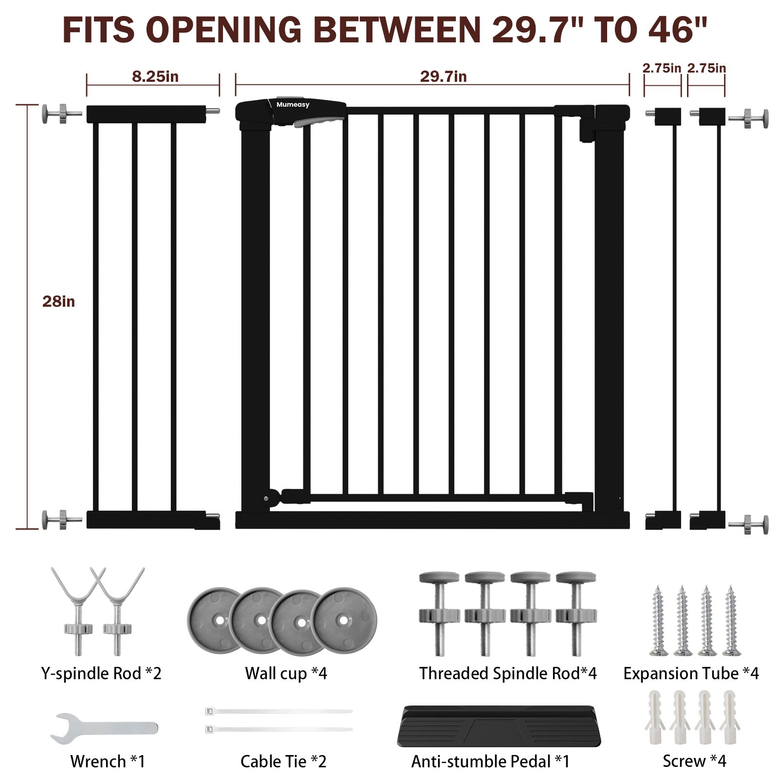 【Extra Wide】This baby gate stands 28" tall and fits openings from 29.7" to 46" wide. With two 2.75" extensions and one 8.26" extension included, you have the flexibility to install it on stairs, in doorways, or in kitchens.