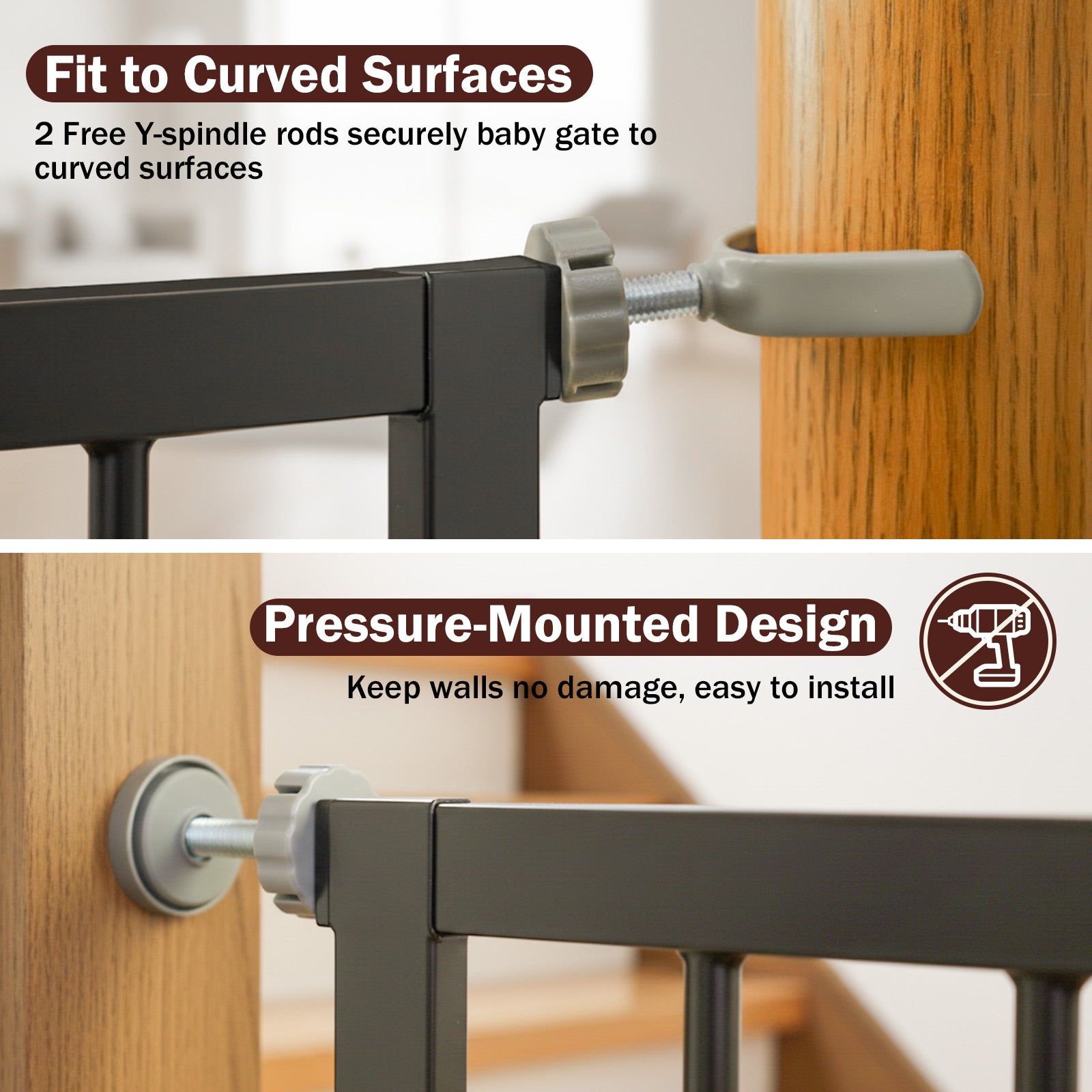 【Fit to Curved Surfaces】Equipped with 2 free Y-shaped bracket, this baby gate for stairs securely fits curved or rounded stair railings, providing extra stability and versatile protection for your home.
