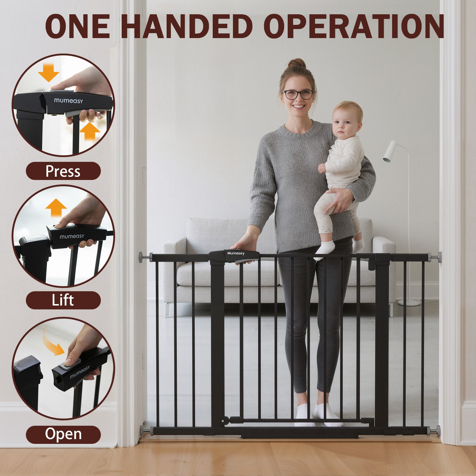 【Dual-Locking Safety】The secure dual-lock mechanism keeps the baby gate safely closed to prevent accidental openings, while the one-hand operation makes passing through easy—even when you're holding a child or grabbing things on the go.