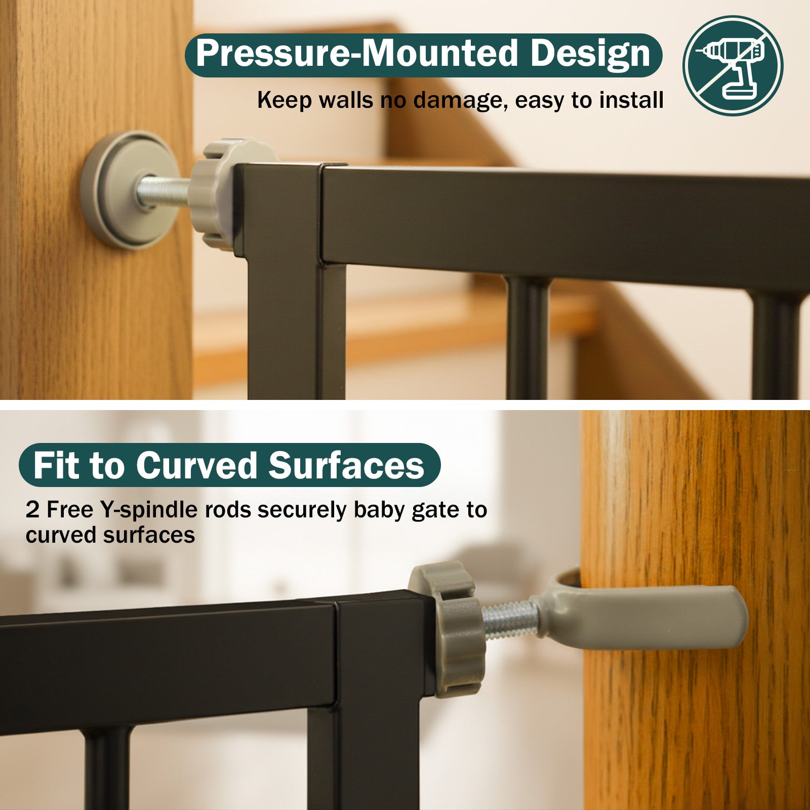 【No Drilling Installation】No need to worry about damaging your walls or dealing with a complicated setup. The pressure-mounted design makes it easy to install our baby and pet gate, and you also have the option to secure it with screws for added stability.