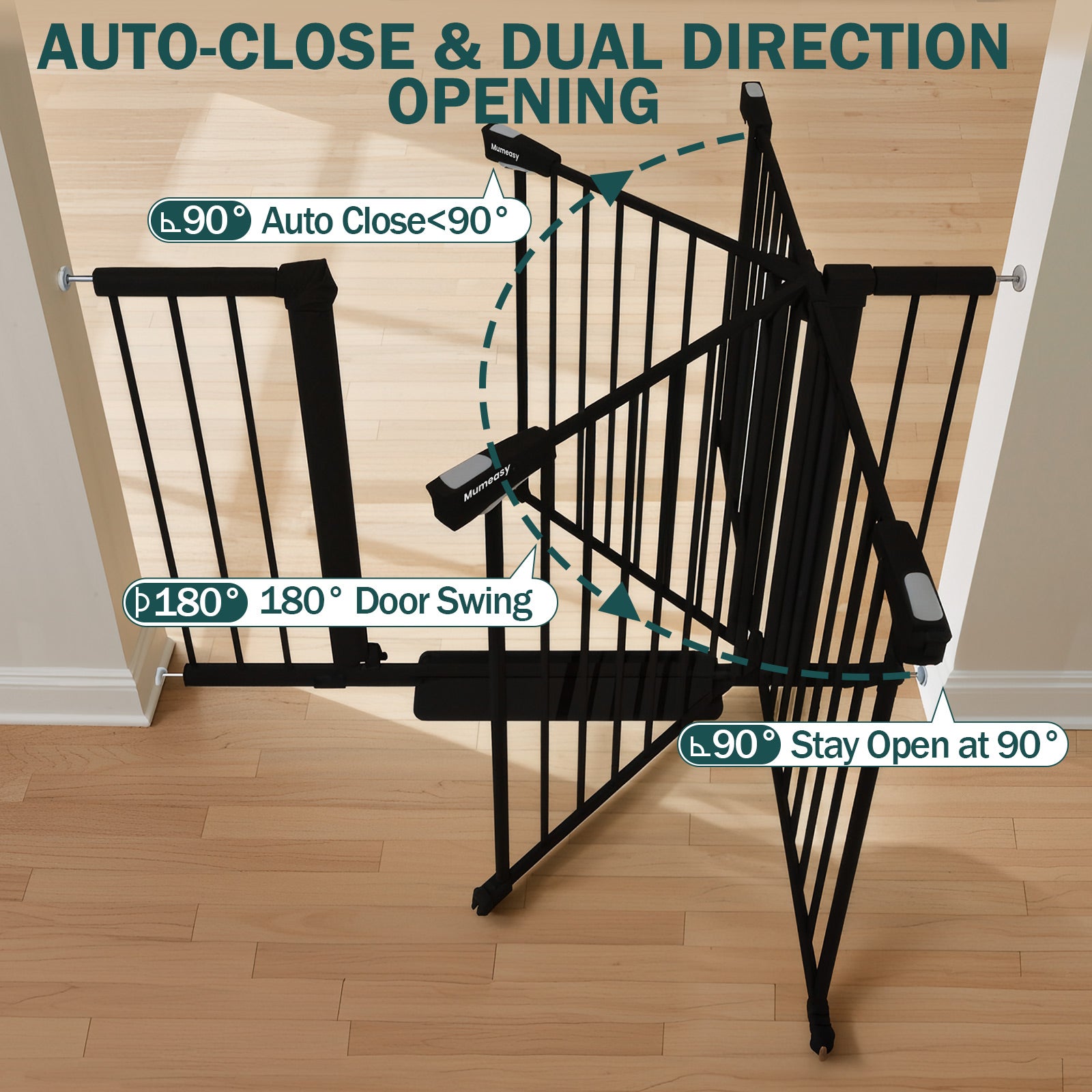 【Auto-close】This baby gate features an auto closing function. When the door is opened to less than a 90° angle, it will close on its own, minimizing the risk of leaving it open for pets and infants. The door swings in both directions and can be effortlessly operated with one hand.