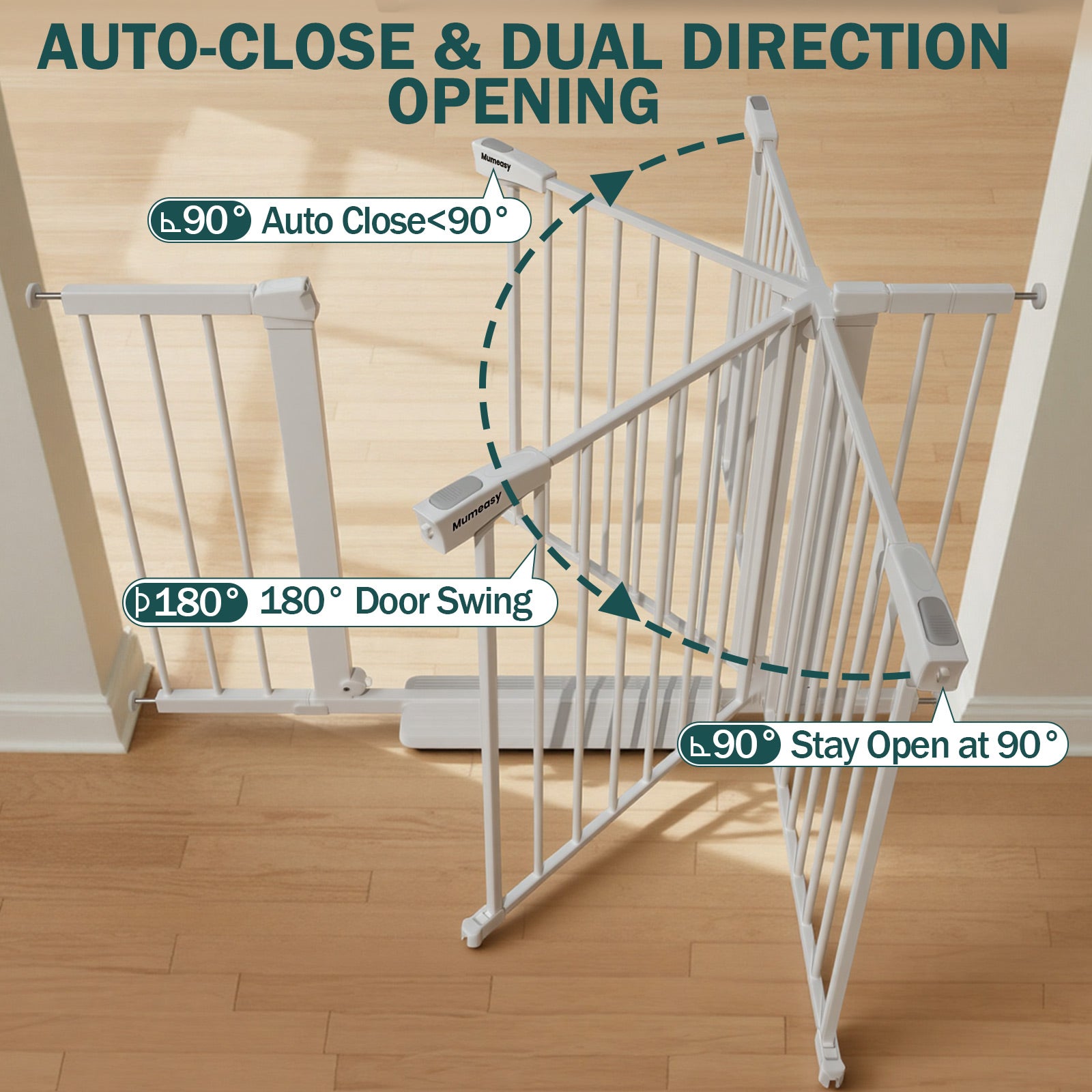 【Auto-close】This baby gate features an auto closing function. When the door is opened to less than a 90° angle, it will close on its own, minimizing the risk of leaving it open for pets and infants. The door swings in both directions and can be effortlessly operated with one hand.
